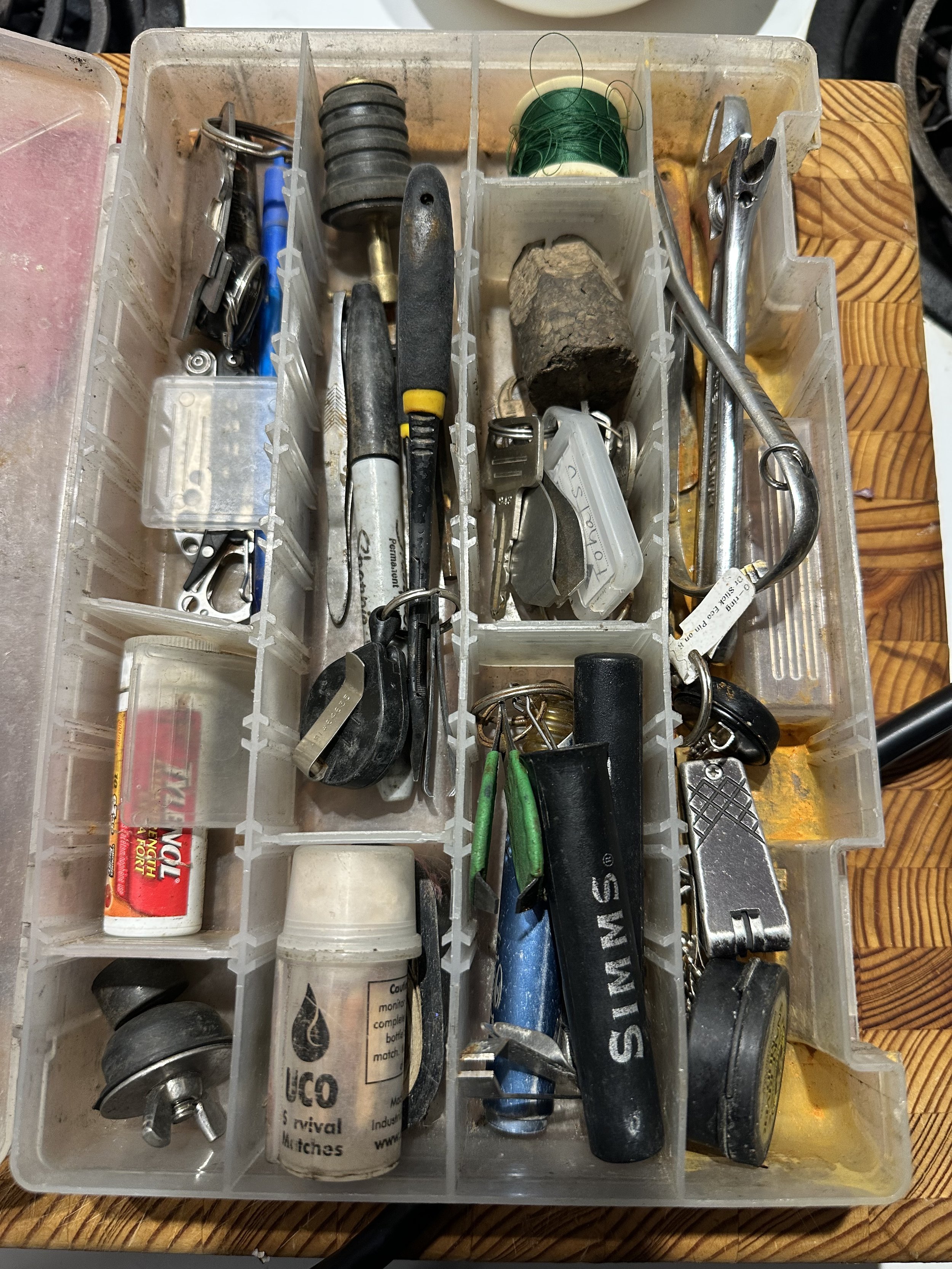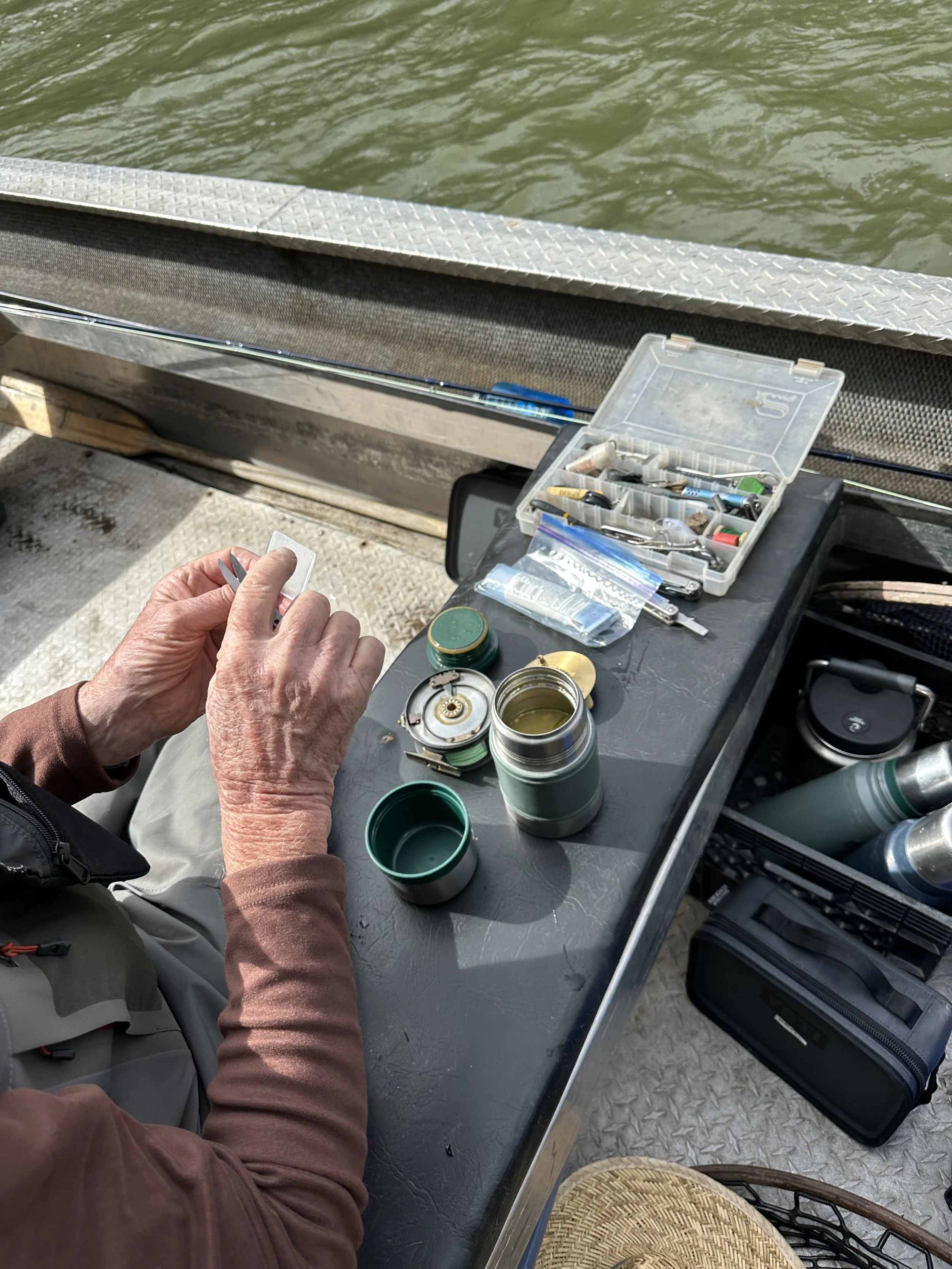 Shortly after this, he caught a beautiful Hen and was brimming with Joy. During the tussle, his old Hardy began to free-spool and it needed some love. He opened it up like he’d done it a thousand times before. He rode around with me while I saw to the other guests. I was interested in the repair, but too busy with the other guests to pay much attention. He had kind of surrendered to it being “done for the day,” but I told him to have a look in my “Emergency box”. I have carried this little box with me since I started guiding. Its contents have remained mostly the same, with things that have come and gone, additions and subtractions over the years as necessary. Its a good start if you are in a bind to repair something.